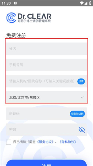 2、填寫姓名、手機(jī)號(hào)碼,輸入機(jī)構(gòu)/醫(yī)院名稱并搜索選擇,選擇所在省、市、區(qū)。