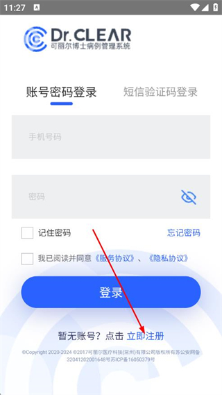 1、打開可麗爾博士APP,在登錄頁(yè)面點(diǎn)擊立即注冊(cè)。