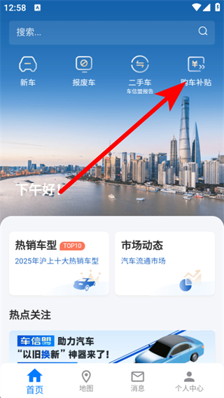 1、打開車信盟APP首頁,點擊購車補貼,進入汽車置換補貼頁面。