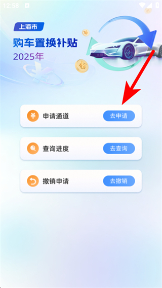 3、進入購車置換補貼申請頁面后,點擊申請通道的去申請。
