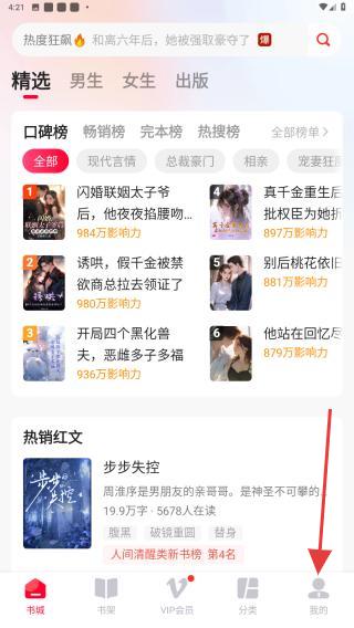 1、啟動(dòng)熱門小說(shuō)大全APP進(jìn)入到首頁(yè),點(diǎn)擊右下角導(dǎo)航欄處的我的圖標(biāo)。