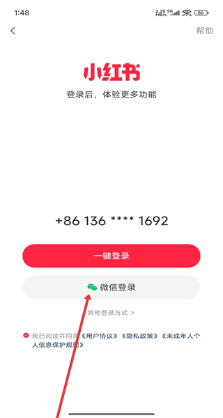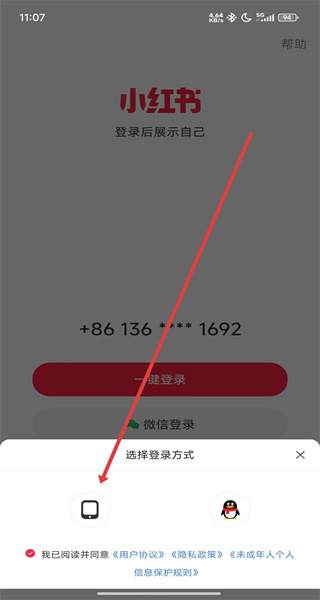 1、在小紅書選擇登錄方式彈窗里,點(diǎn)擊手機(jī)樣式的圖標(biāo),進(jìn)入本機(jī)號(hào)碼相關(guān)登錄頁(yè)。