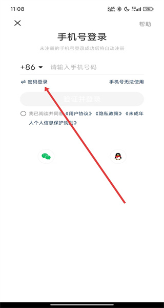 3、在手機(jī)號(hào)登錄界面,點(diǎn)擊密碼登錄,進(jìn)入密碼登錄專屬頁(yè)面。