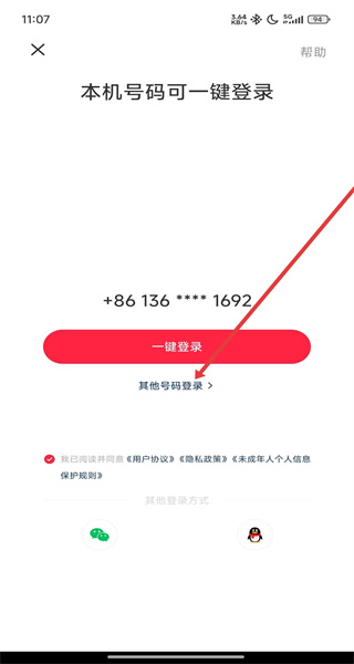 2、在本機(jī)號(hào)碼可一鍵登錄頁(yè)面,點(diǎn)擊其他號(hào)碼登錄,切換到手機(jī)號(hào)登錄界面。