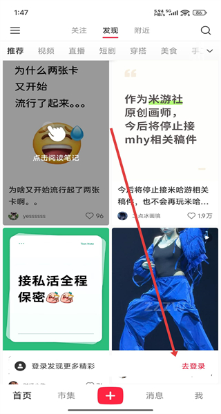 2、在進(jìn)入到小紅書首頁(yè)中,可以點(diǎn)擊下方去登錄按鈕,進(jìn)行登錄操作。