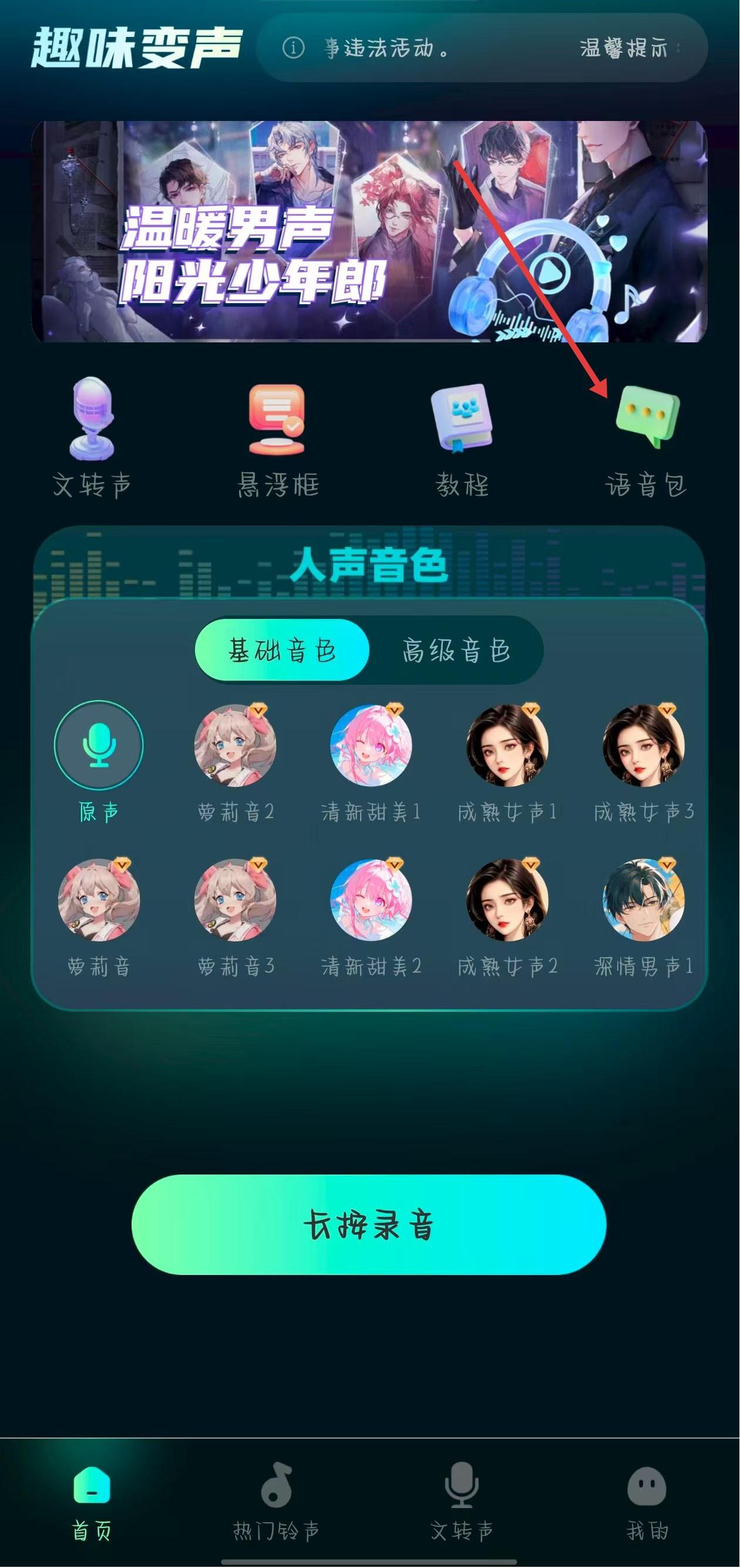 1、打開(kāi)手游免費(fèi)變聲器應(yīng)用,在首頁(yè)點(diǎn)擊語(yǔ)音包選項(xiàng),進(jìn)入語(yǔ)音包選擇界面。