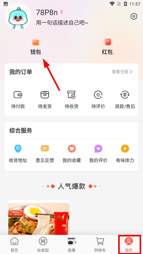 1、打開(kāi)有味生活app,點(diǎn)擊底部我的圖標(biāo),在頁(yè)面中找到并點(diǎn)擊錢包選項(xiàng),進(jìn)入錢包管理界面。