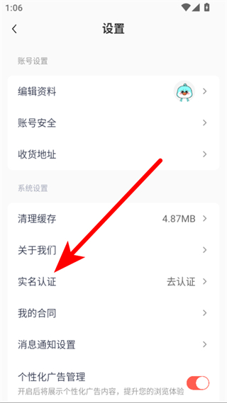 3、在設(shè)置界面里,點(diǎn)擊實(shí)名認(rèn)證選項(xiàng),進(jìn)入實(shí)名認(rèn)證頁(yè)面。
