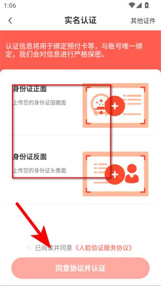 4、在實(shí)名認(rèn)證頁(yè)面,上傳身份證正面、反面圖片,點(diǎn)擊同意協(xié)議并認(rèn)證按鈕,即可完成實(shí)名認(rèn)證操作。