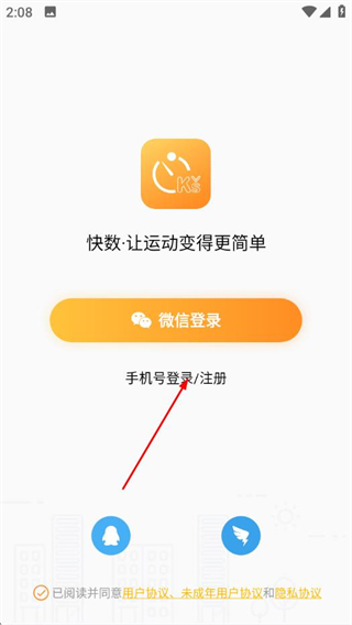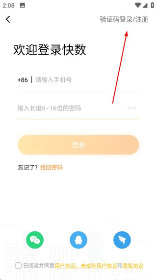 1、打開快數(shù)APP,點擊手機號登錄/注冊選項。