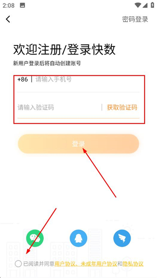 3、輸入手機號和驗證碼,勾選協(xié)議,點擊登錄。