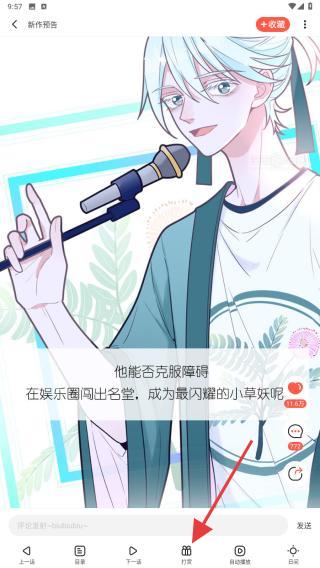 3、點(diǎn)擊屏幕展示出功能欄目,再找到打賞按鈕并點(diǎn)擊,選擇打賞金額或道具,確認(rèn)后即可完成打賞。
