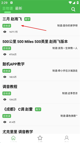 3、登錄后返回吉他譜頁面,點(diǎn)擊想要查看的譜子,如三月趙雨飛。