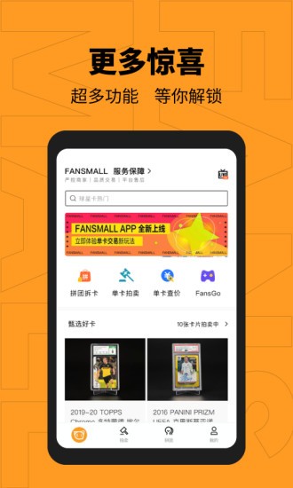 fansmall app是一款提供集資訊輸出、交易流通、單品直購、高端拍賣、上組拼團、增值服務的一站式生態(tài)平臺,擁有業(yè)內上乘貨品、過硬服務平臺、專業(yè)研發(fā)團隊,一流售后體系,包含NBA、世界杯、歐洲杯、MLB等全品類體育藏卡,可覆蓋國內外超百萬量級用戶。fansmall會竭力迭代優(yōu)化,以期帶給廣大用戶更精致、深度、溫暖的使用體驗,讓行業(yè)內收藏與交互更便捷,加促中國球星卡行業(yè)規(guī)范化,打造一個影響力與價值度始終提升的收藏平臺。