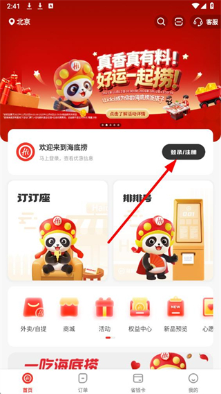 1、在海底撈app首頁,點擊登錄注冊按鈕,進入登錄頁面。