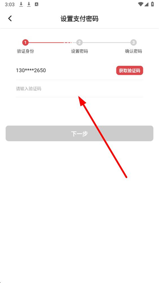 4、在設置支付密碼頁面,獲取并輸入驗證碼,依次完成設置密碼步驟,即可完成支付密碼的設置。