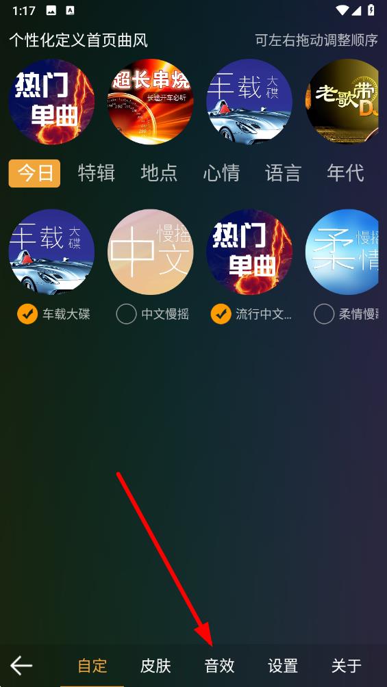 2、在頁面下方的導(dǎo)航欄中,點(diǎn)擊音效選項(xiàng),進(jìn)入音效調(diào)節(jié)界面。