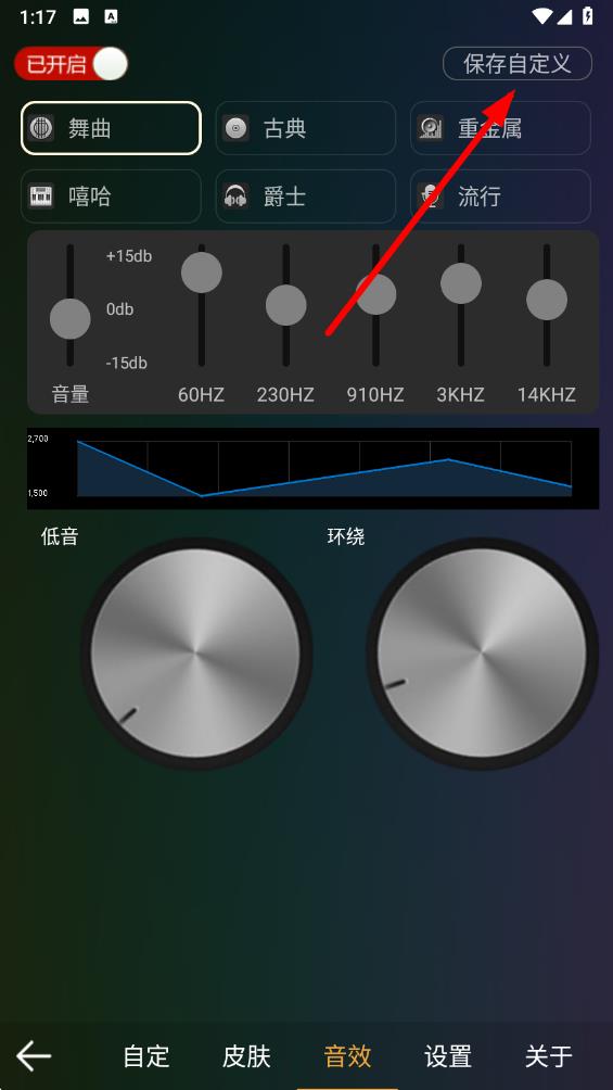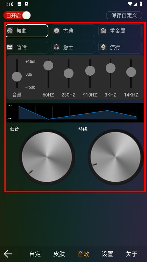 4、完成音效調(diào)整后,點(diǎn)擊界面右上角的保存自定義按鈕,留存設(shè)置,下次打開即可使用自定義音效。