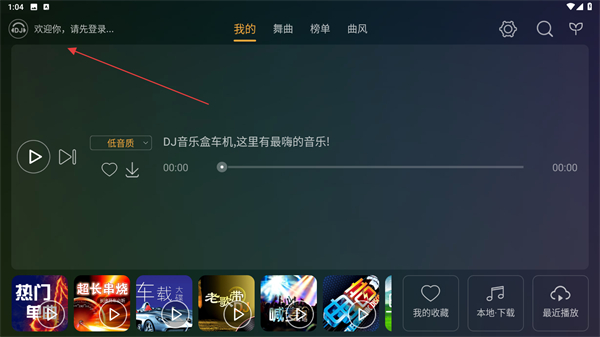 1、打開dj音樂盒APP,進(jìn)入時(shí)點(diǎn)擊左上角歡迎你,請先登錄的區(qū)域。