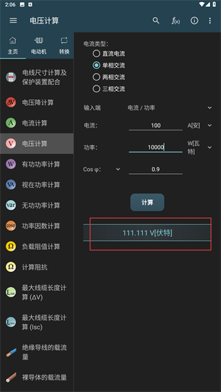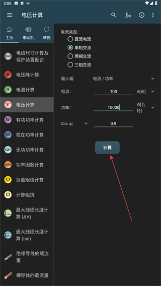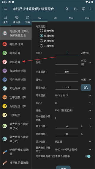 1、打開電工計算器APP,在左側點擊電壓計算的按鈕。