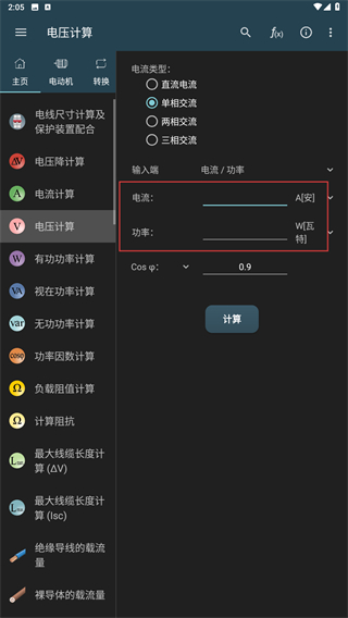 2、進入電壓計算的頁面內,輸入電流、功率。