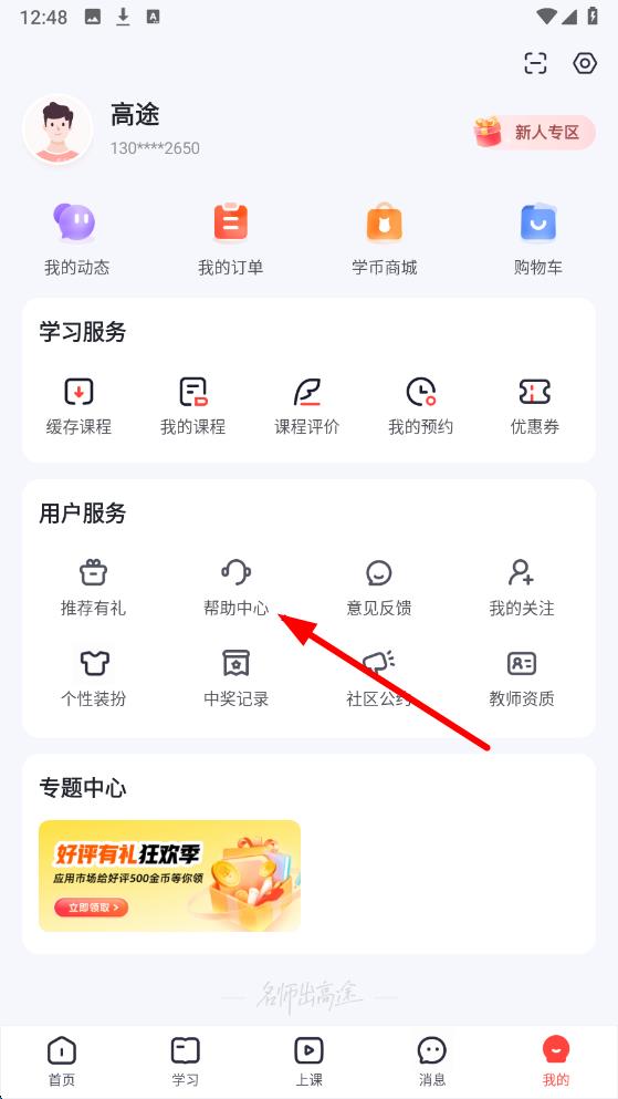 2、在我的頁面里找到用戶服務板塊,點擊其中的幫助中心選項。