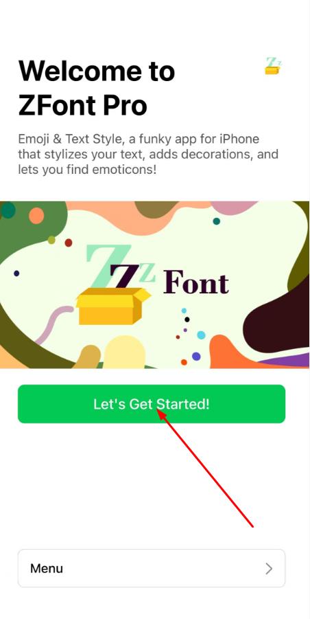 1、首先下載完成需要去打開ZFont Pro應(yīng)用,點(diǎn)擊歡迎頁(yè)綠色按鈕Let's Get Started!進(jìn)入應(yīng)用。