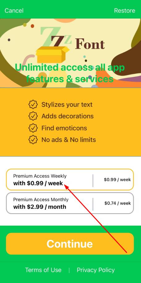 2、進(jìn)入訂閱頁(yè)面,可選擇【Premium Access Weekly with $0.99/week】等訂閱套餐,解鎖應(yīng)用全部功能與服務(wù)。