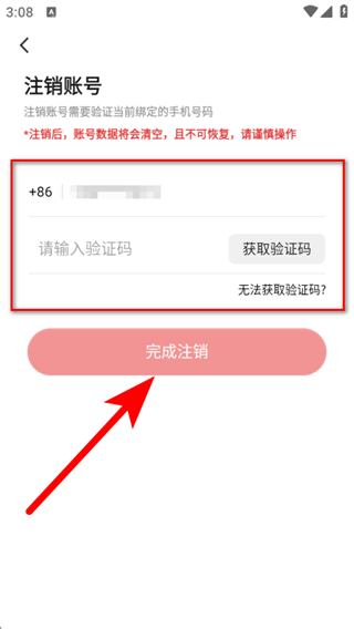 4、在注銷賬號頁面,輸入手機號獲取并填寫驗證碼,點擊完成注銷。