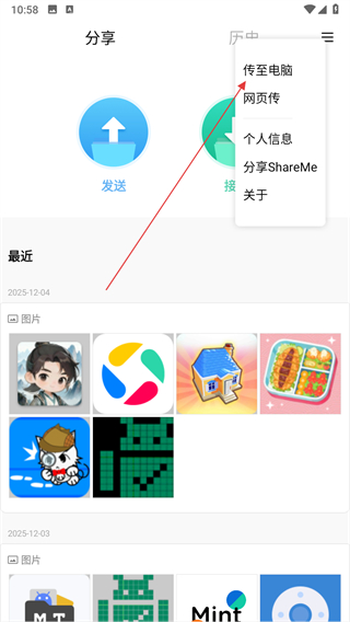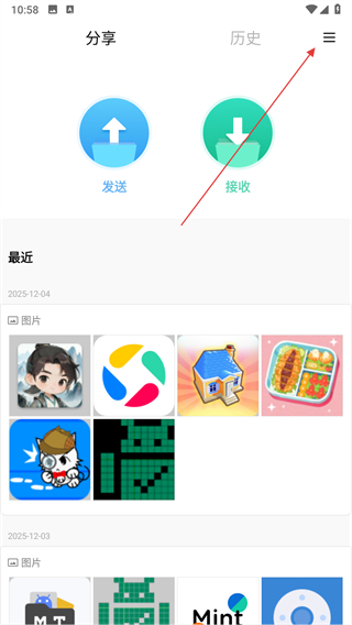 1、打開小米快傳應(yīng)用,進(jìn)入分享頁(yè)面,點(diǎn)擊頁(yè)面三條橫線形狀的菜單按鈕。