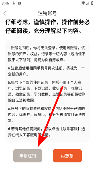 4、在注銷賬號頁面,仔細閱讀注銷說明后,點擊申請注銷按鈕,即可完成賬號注銷操作。