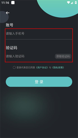 3、在賬號登錄界面,輸入手機(jī)號、驗(yàn)證碼。