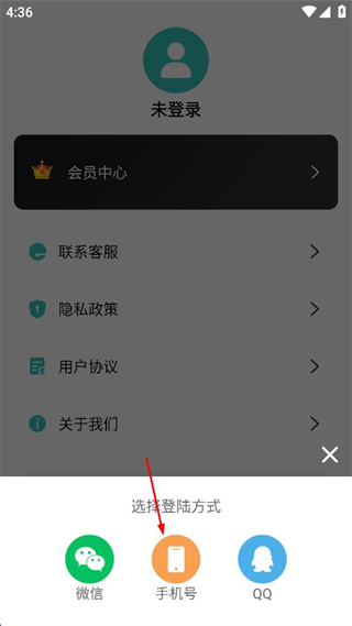 3、選擇登錄方式,點(diǎn)擊手機(jī)號登錄選項。