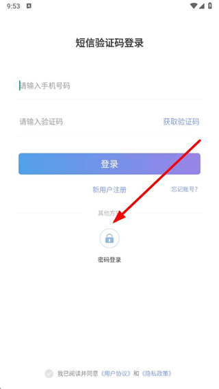 1、在短信驗(yàn)證碼登錄界面,找到下方密碼登錄選項(xiàng)并點(diǎn)擊,切換至密碼登錄模式。