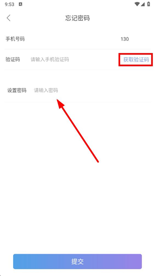 3、在忘記密碼界面,確認(rèn)已填手機(jī)號(hào)碼,獲取驗(yàn)證碼輸入,填寫新密碼,最后點(diǎn)擊提交。