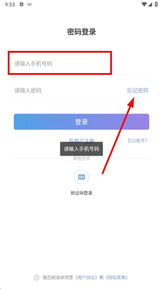 2、在密碼登錄界面,輸入手機(jī)號(hào)碼后,點(diǎn)擊右側(cè)忘記密碼按鈕。