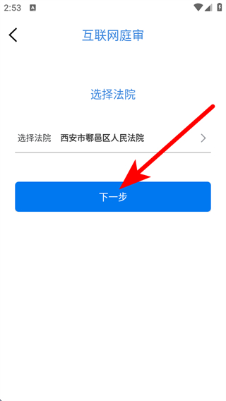 1、在互聯(lián)網(wǎng)庭審的頁面,我們需要選擇目標法院后點擊下一步。