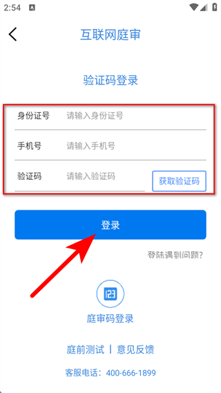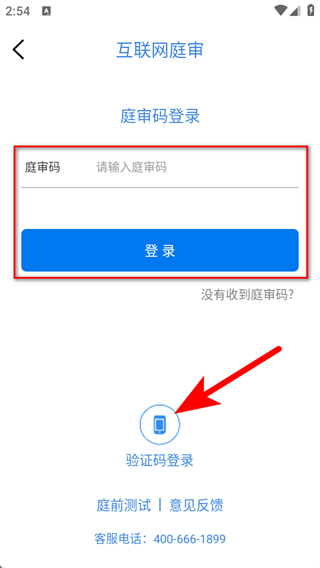 2、進入登錄的頁面后,可以選擇輸入庭審碼的方法或者驗證碼登入。