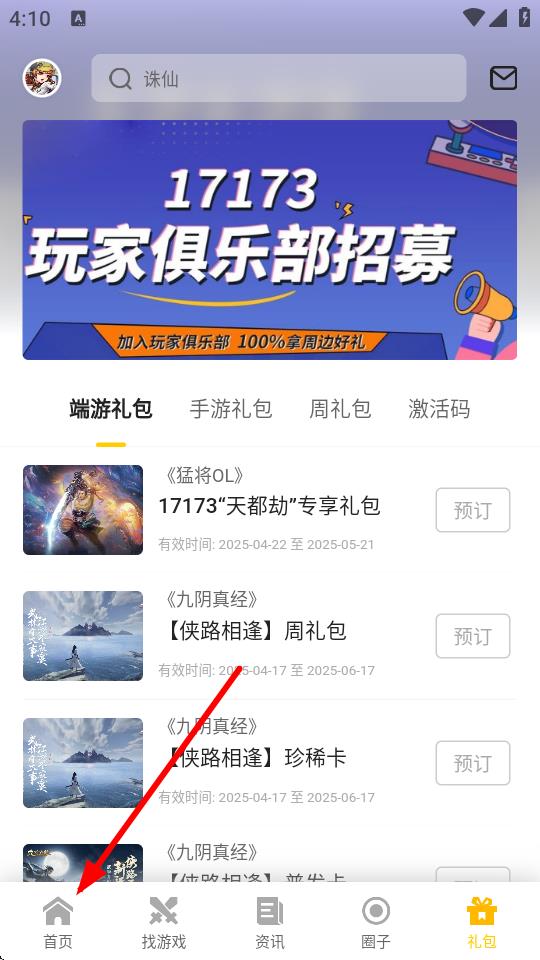 1、打開17173游戲應(yīng)用,點(diǎn)擊底部導(dǎo)航欄中的首頁。