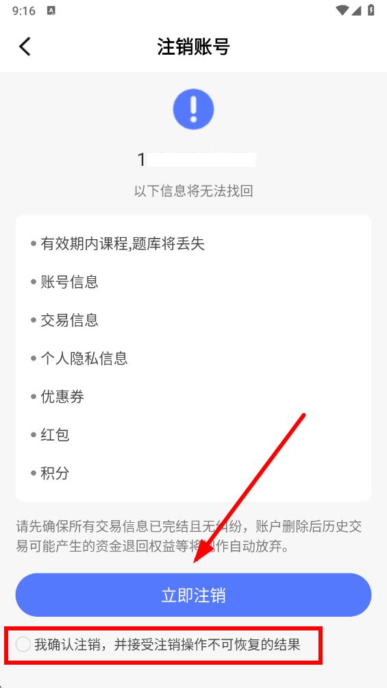4、在注銷賬號界面,閱讀相關(guān)提示信息后,勾選確認注銷的選項框,再點擊立即注銷按鈕完成注銷。