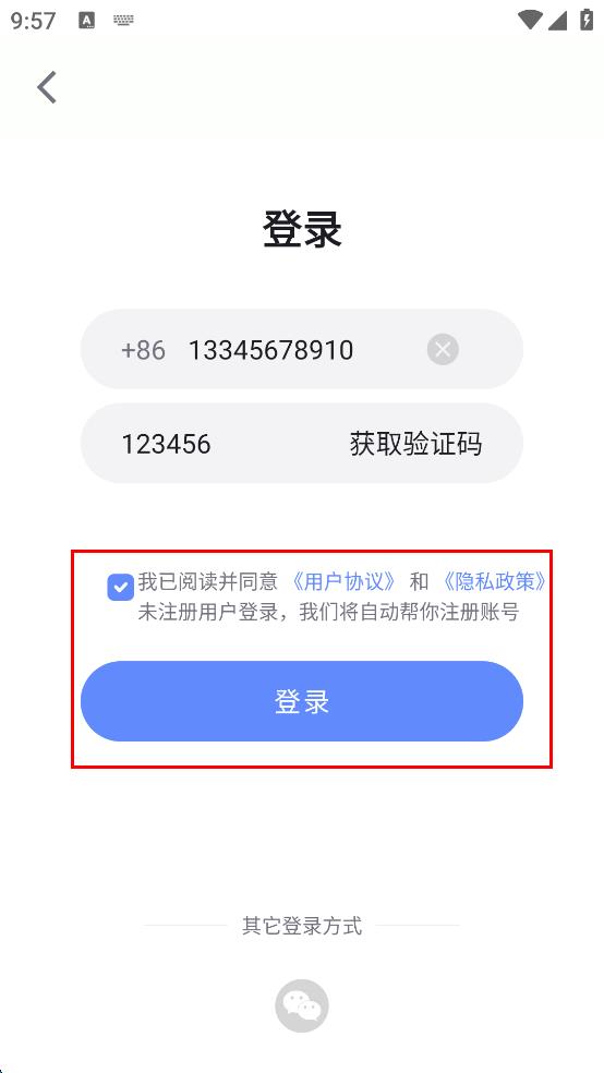 4、輸入完成后,勾選“我已閱讀并同意用戶協(xié)議和隱私政策,最后點擊“登錄”按鈕,即可完成驗證碼登錄流程。