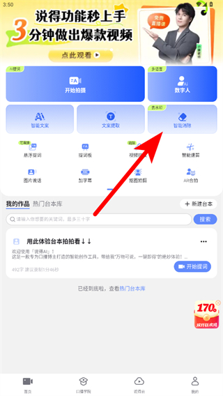 1、打開說得AI APP,在首頁點擊智能消除,進入智能消除功能頁面。