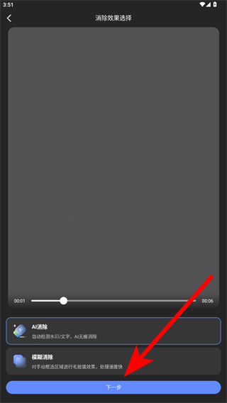 3、視頻導(dǎo)入后,進入消除效果選擇頁面,選擇合適消除方式后點擊下一步。