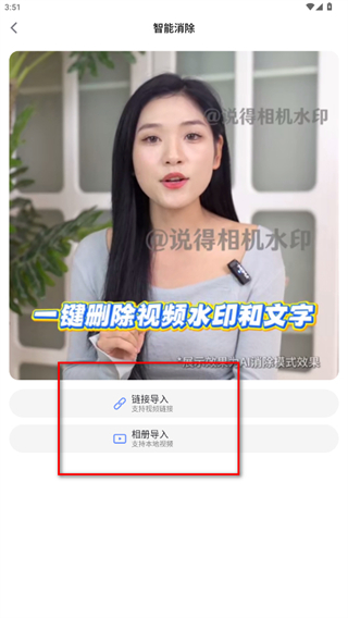 2、在智能消除頁面,選擇鏈接導(dǎo)入或相冊導(dǎo)入,添加需要處理的視頻。
