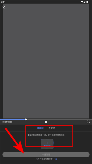 4、在視頻編輯頁面,選擇去水印選項,點擊一鍵消除,完成水印消除操作。