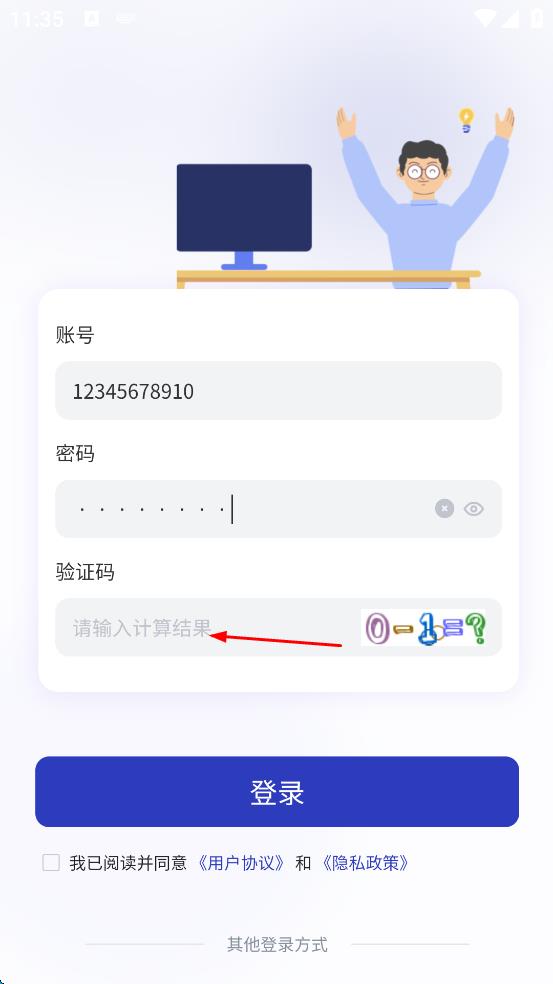 3、在密碼輸入框中輸入密碼,再根據(jù)右側(cè)計算提示,算出結(jié)果并輸入到驗證碼輸入框。