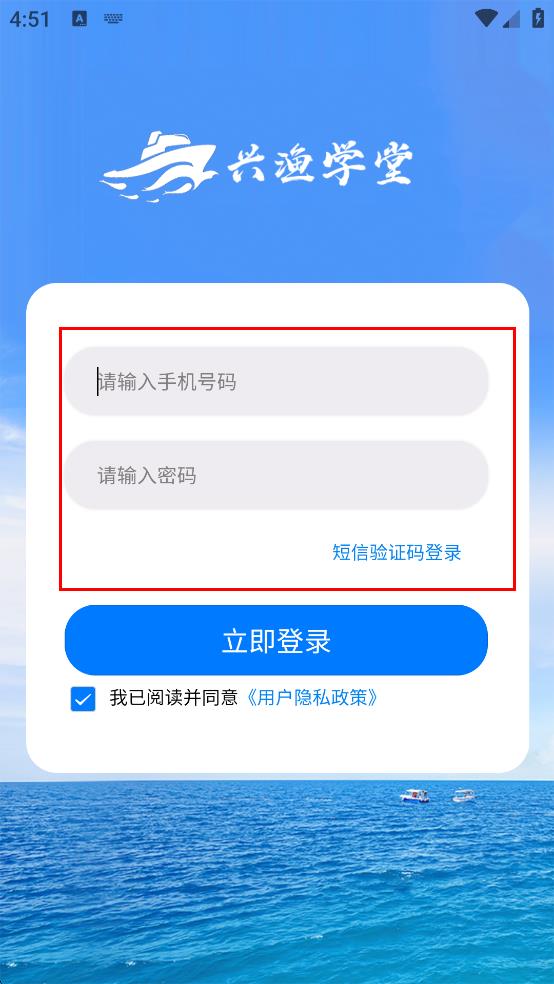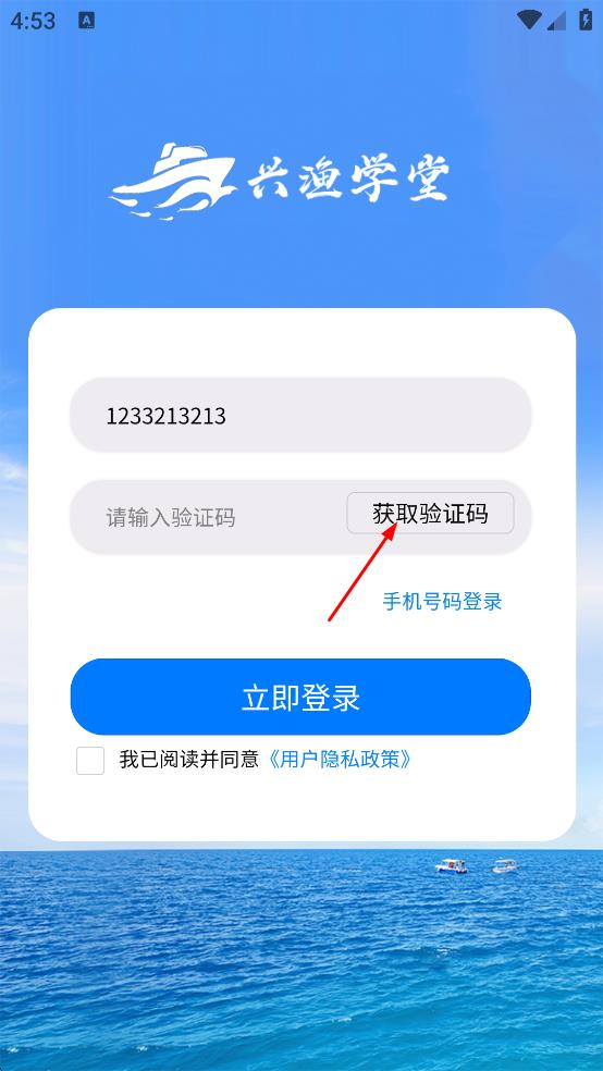 4、將收到的驗證碼輸入到對應(yīng)的驗證碼輸入框中,確認信息無誤后,點擊“立即登錄”按鈕,即可完成興漁學堂APP的登錄操作。