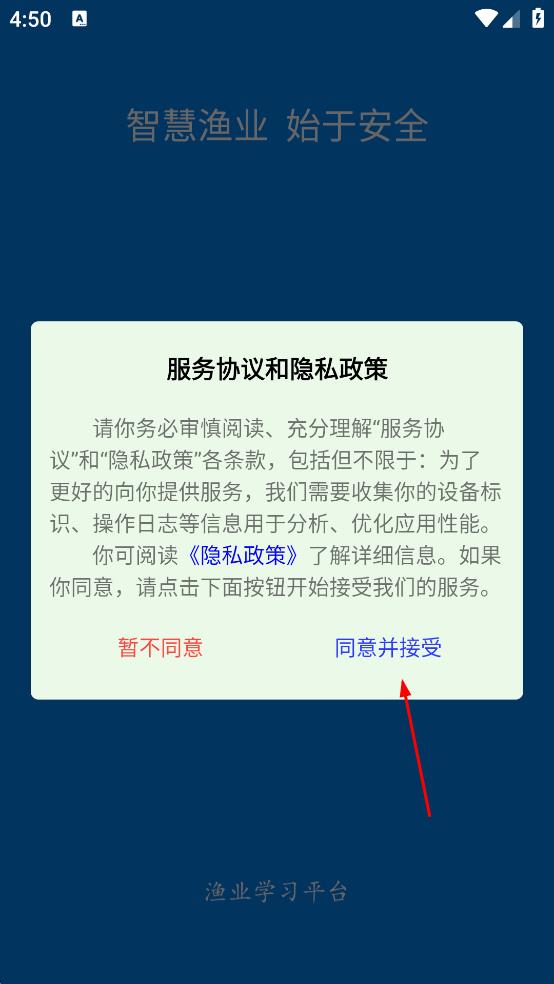 1、打開興漁學堂APP,在服務(wù)協(xié)議和隱私政策頁面,點擊“同意并接受”,進入APP主界面后,點擊右下角“我的”。