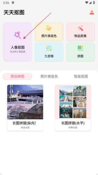 1、打開天天摳圖應(yīng)用,在主界面選擇人像摳圖功能,進(jìn)入圖片選擇環(huán)節(jié)。