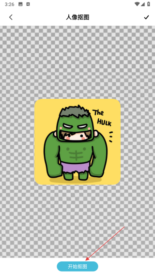 4、進(jìn)入摳圖處理頁(yè)面后,點(diǎn)擊底部的開始摳圖按鈕,軟件會(huì)自動(dòng)識(shí)別并摳取目標(biāo)內(nèi)容,點(diǎn)擊右上角即可將處理好的圖片保存至手機(jī)相冊(cè)。